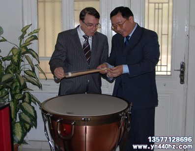 李大使和里亚德部长观看赠送的定音鼓