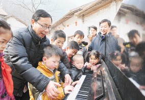 2月1日,团市委干部来到蓝田县九间房镇李家坪村,走访慰问“两联一包”结对帮扶户,送去了近万元慰问金和米面油等年货,还为李家坪村小学赠送了一架钢琴,现场手把手地给孩子们上了一堂钢琴课。 图为团市委的工作人员手把手教孩子们弹钢琴。